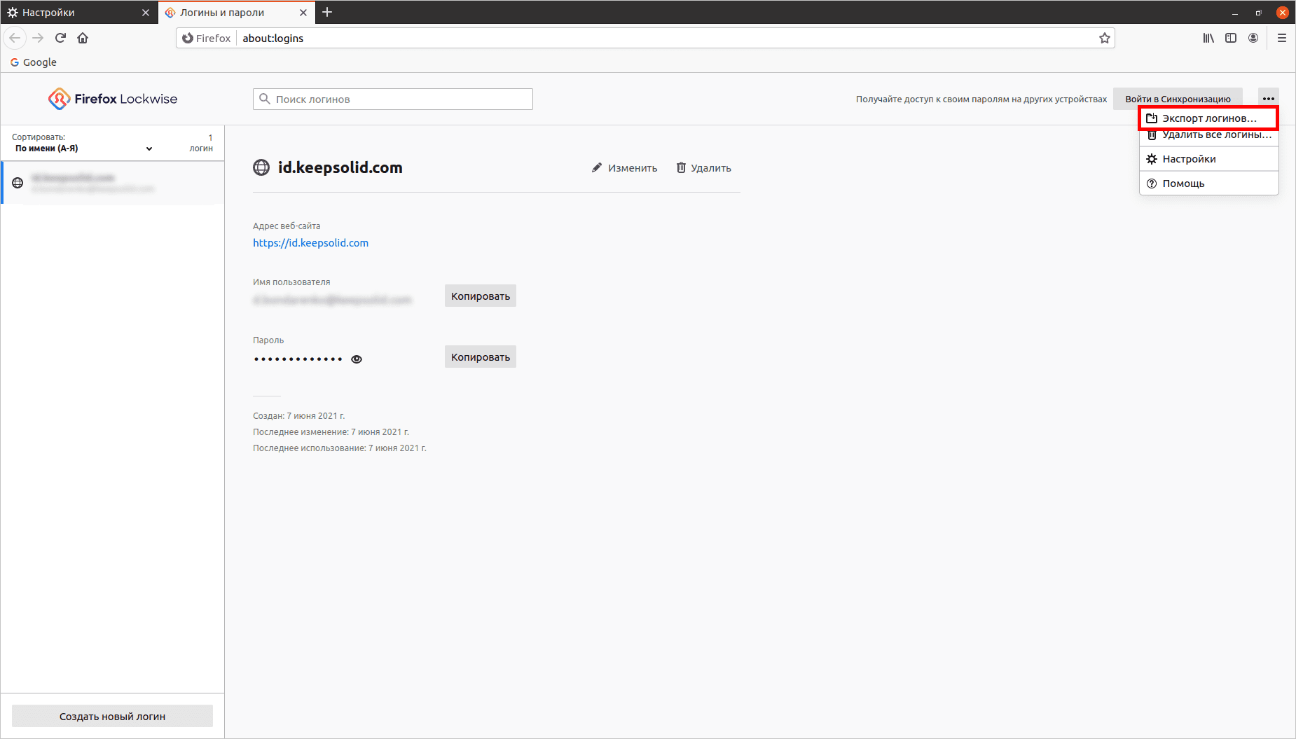 5. Нажмите Экспортировать... и подтвердите свой пароль.