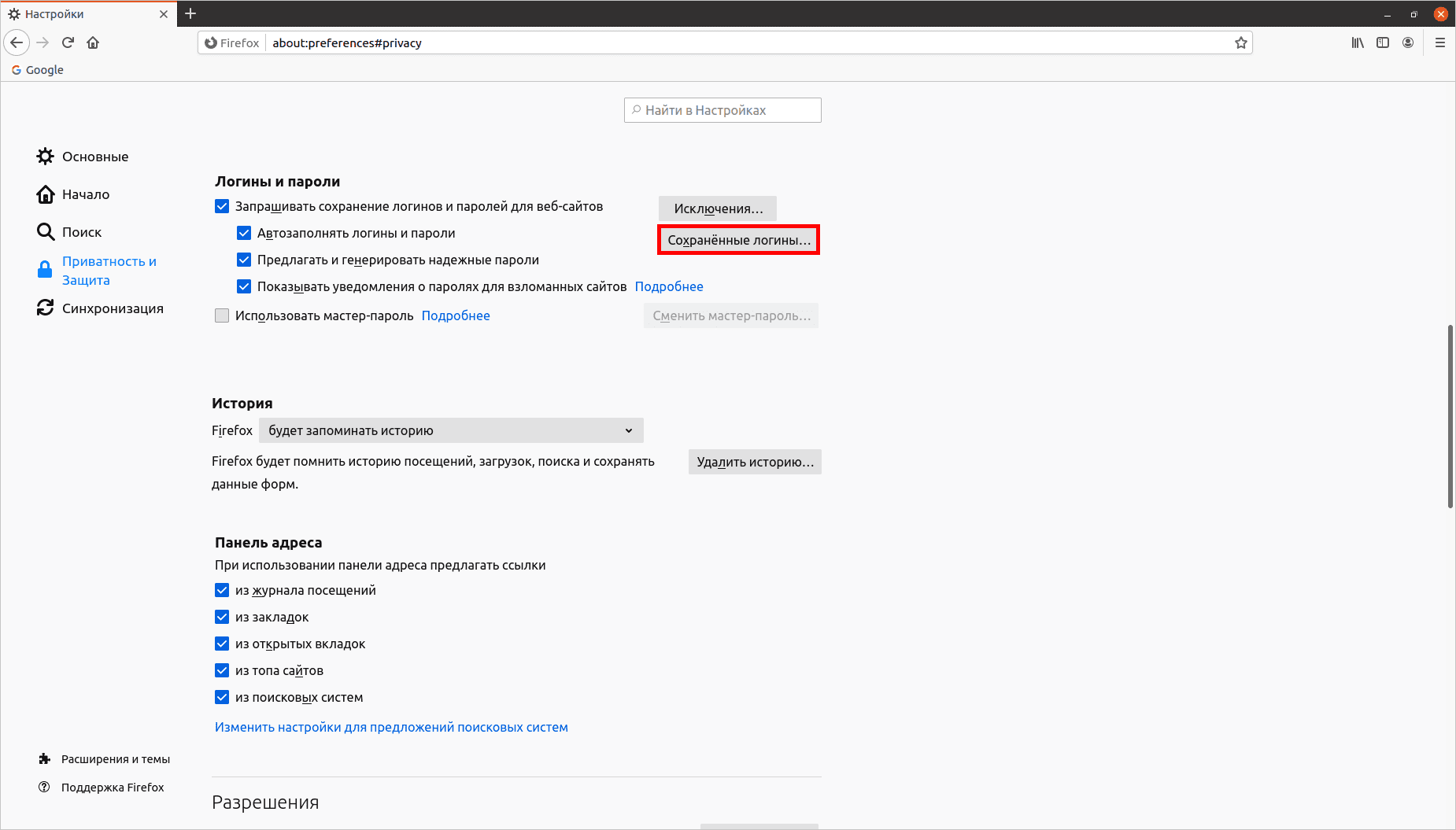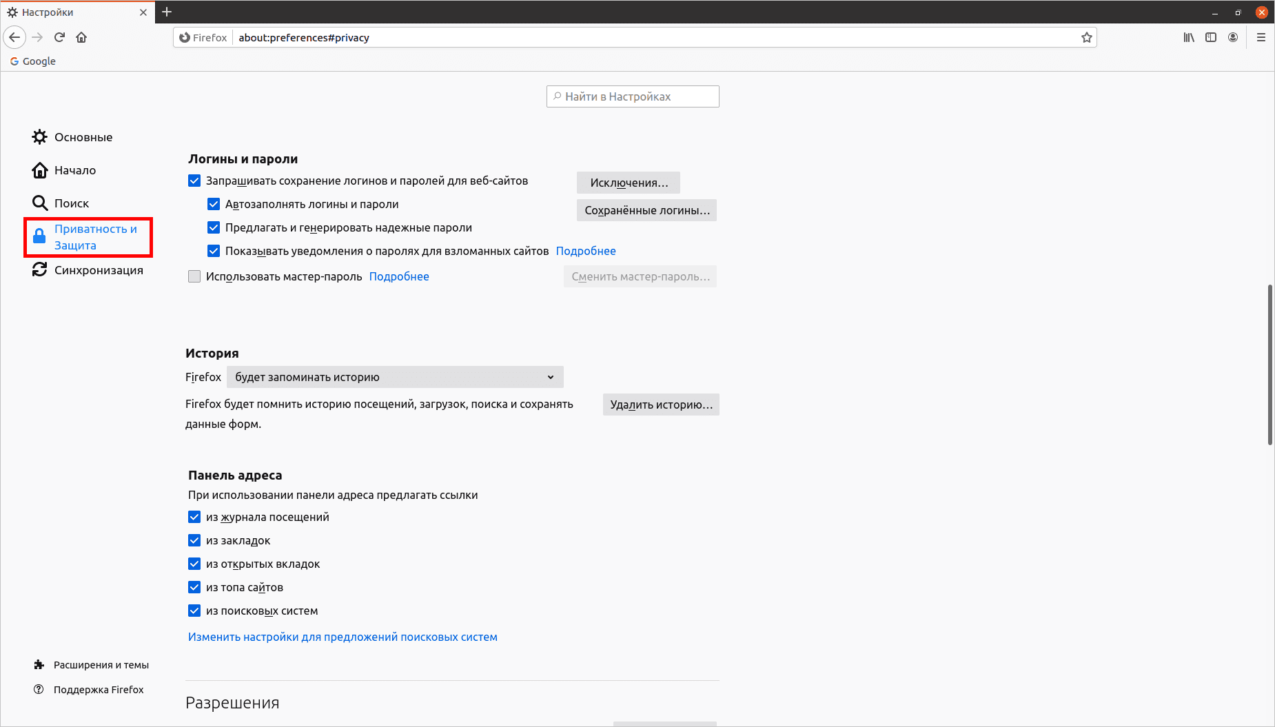 2. Перейдите во вкладку Приватность и защита и пролистайте до раздела Логины и пароли.