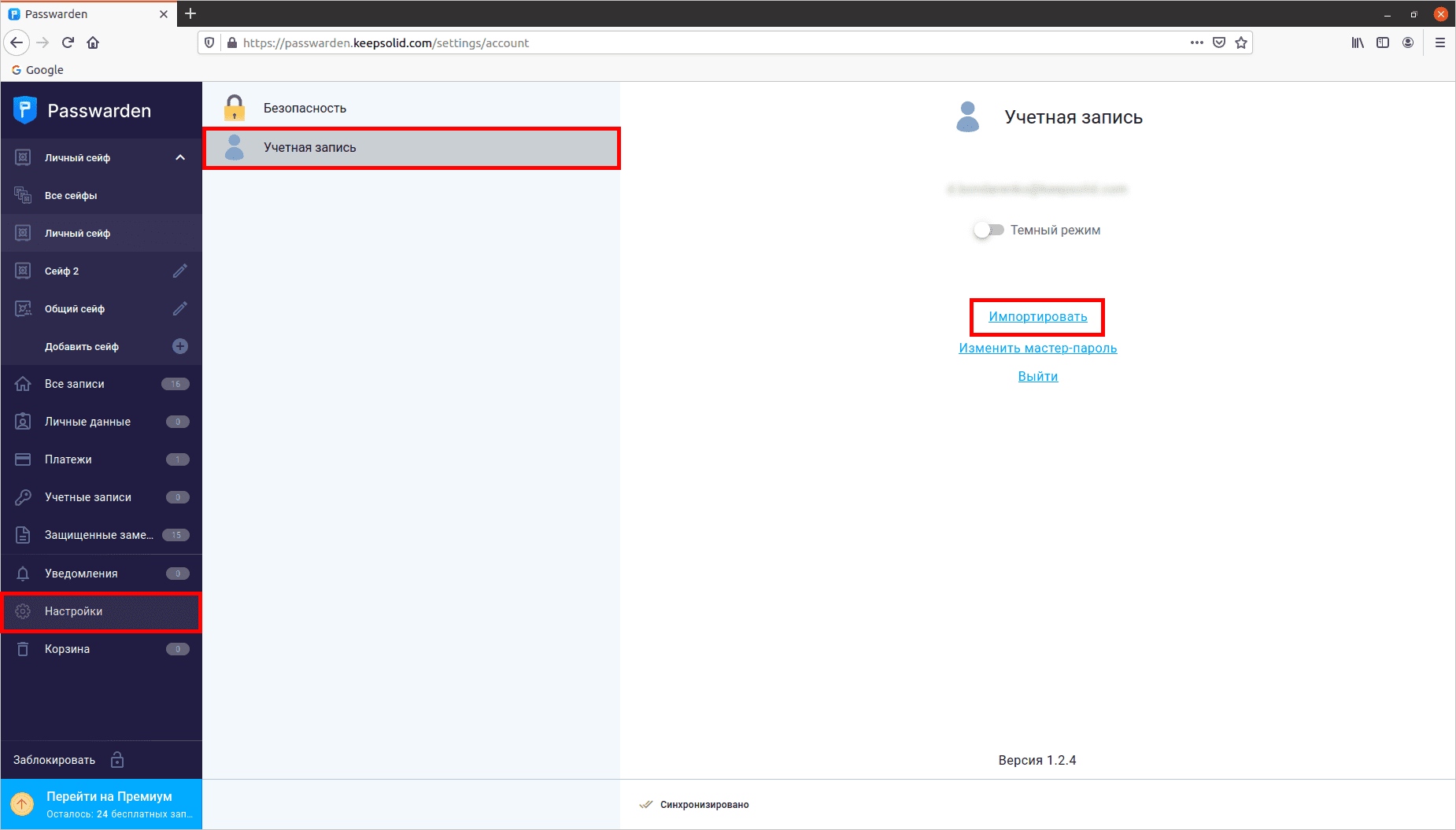 1. Откройте наш безопасный менеджер паролей. Перейдите в меню Настройки > Учетная запись > Импортировать.