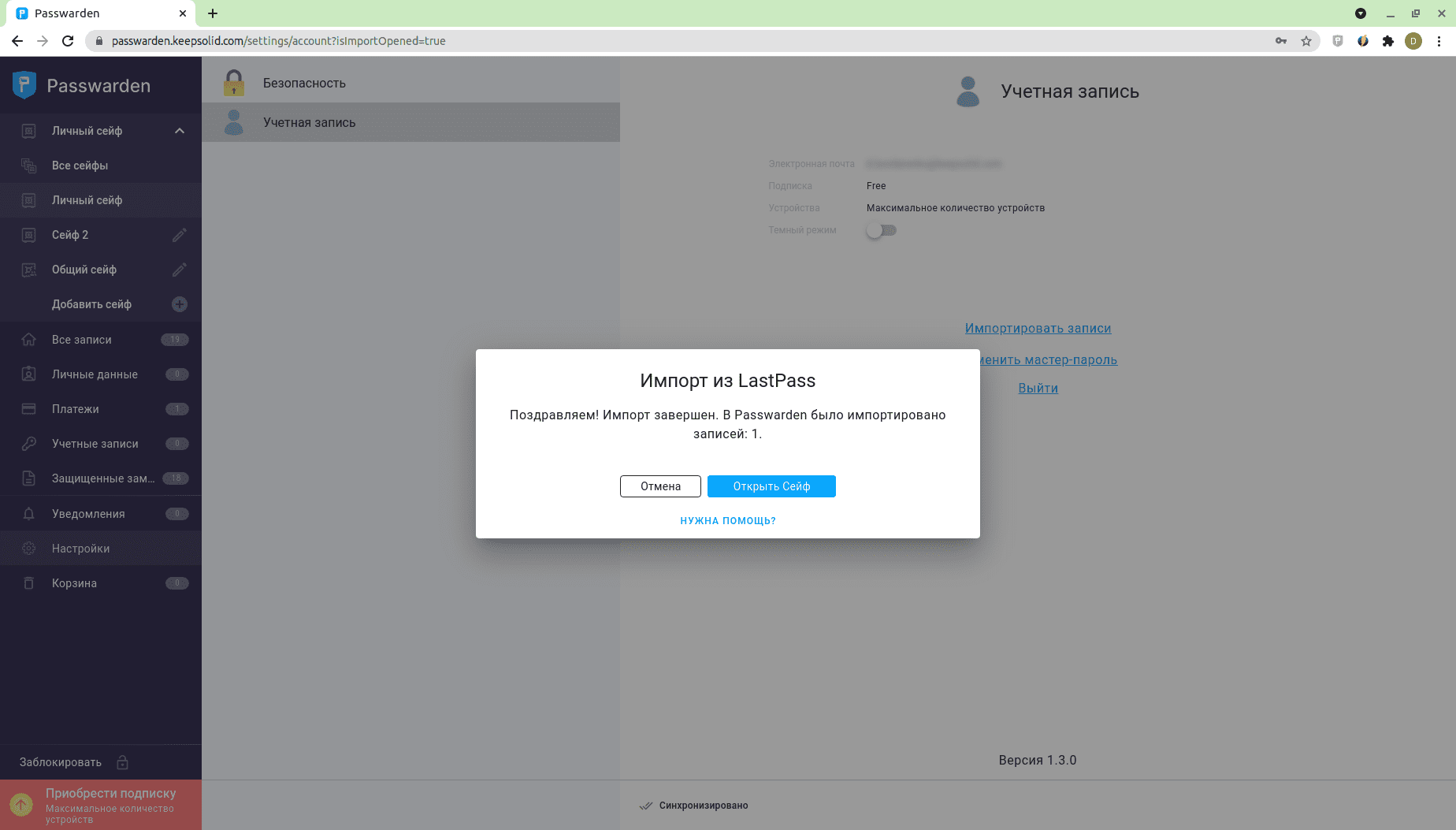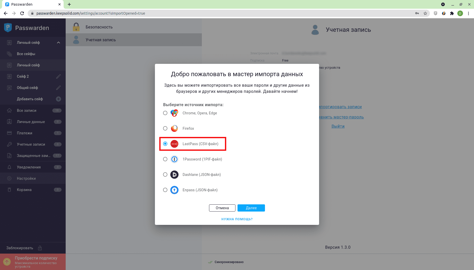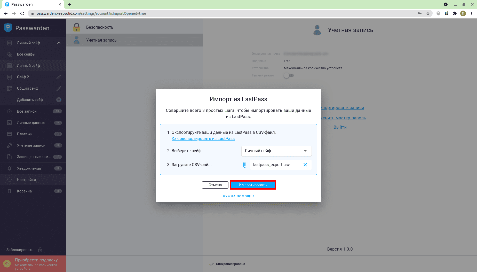 3. Выберите Сейф, в который хотите импортировать свои данные и выберите .csv-файл, который вы экспортировали из LastPass. Нажмите Импортировать.