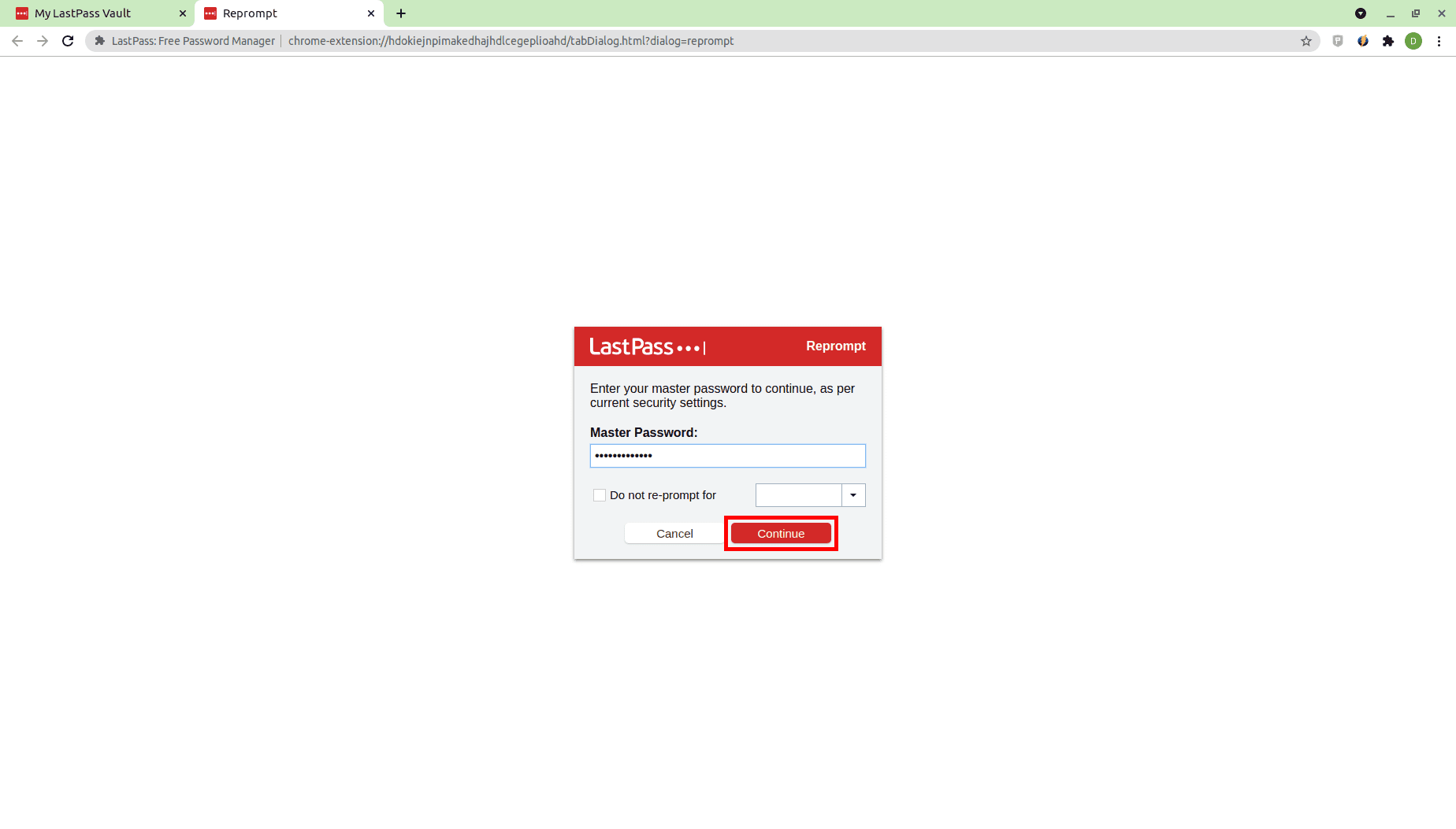 2. Введите свой мастер-пароль и нажмите Продолжить (Continue).