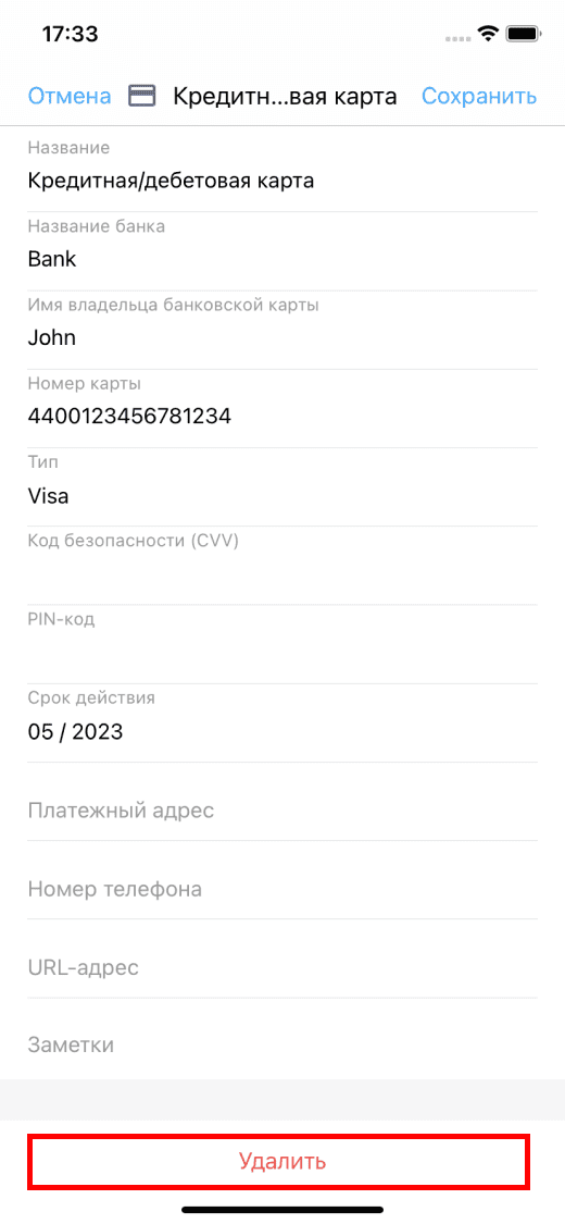 1. Выберите запись, которую хотите удалить, нажав на нее. Запись Кредитная/дебетовая карта выбрана как пример.