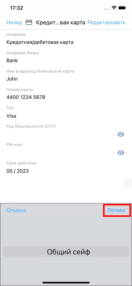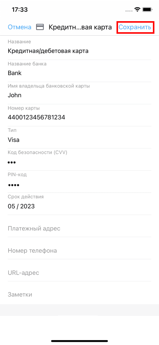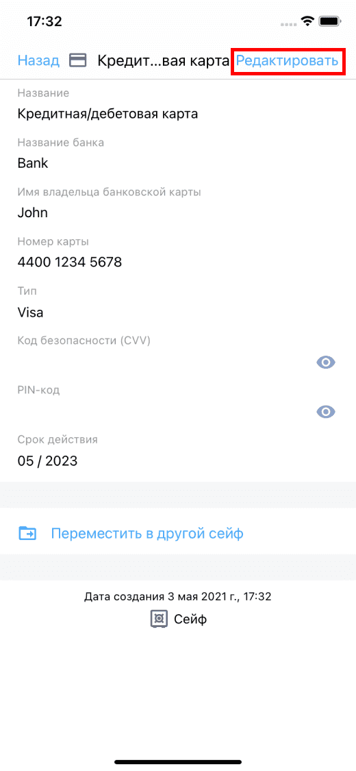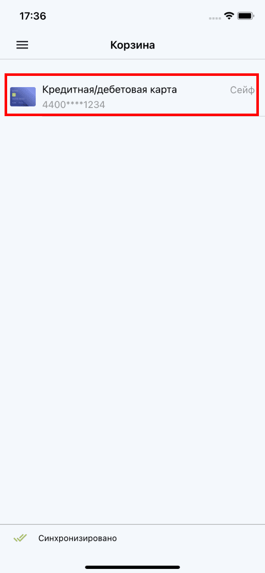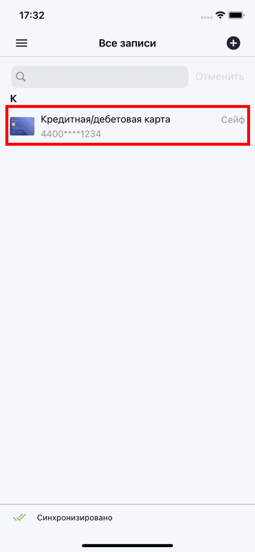 1. Нажмите на запись, которую хотите отредактировать. Запись Кредитная/дебетовая карта выбрана как пример.