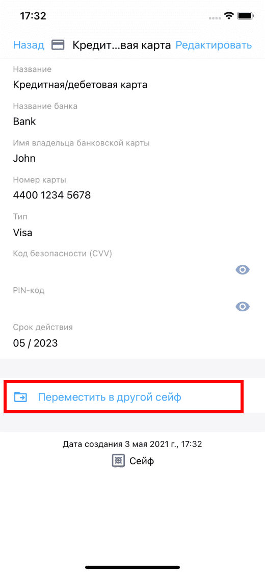 2. Если вы хотите переместить эту запись в другой сейф, нажмите кнопку Переместить в другой сейф и выберите новый сейф для этой записи. Нажмите Готово.