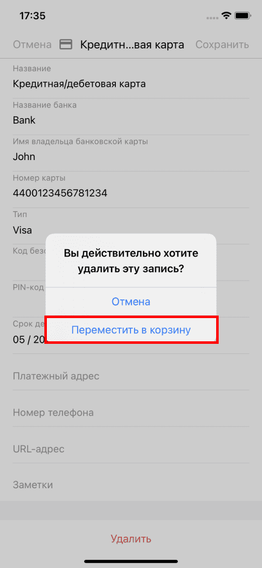 4. Нажмите Переместить в корзину, чтобы подтвердить, что вы хотите удалить эту запись.