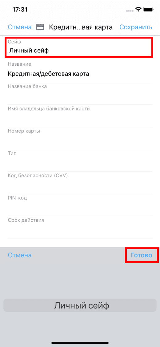 3. Выберите сейф, в котором вы хотите сохранить эту запись. По умолчанию выбран ваш Личный сейф.