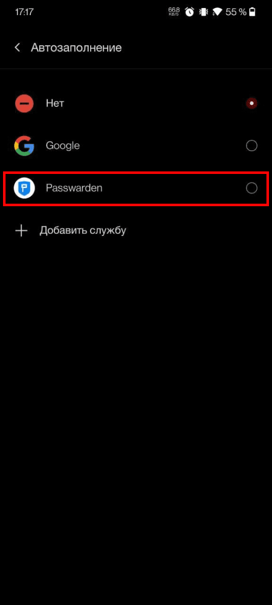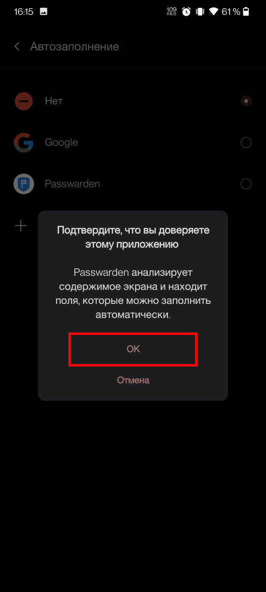 3. Выберите Passwarden в качестве основной службы автозаполнения и нажмите OK.