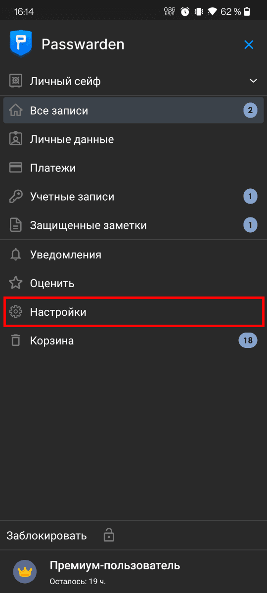 1. Откройте приложение Passwarden и перейдите в меню Настроек.