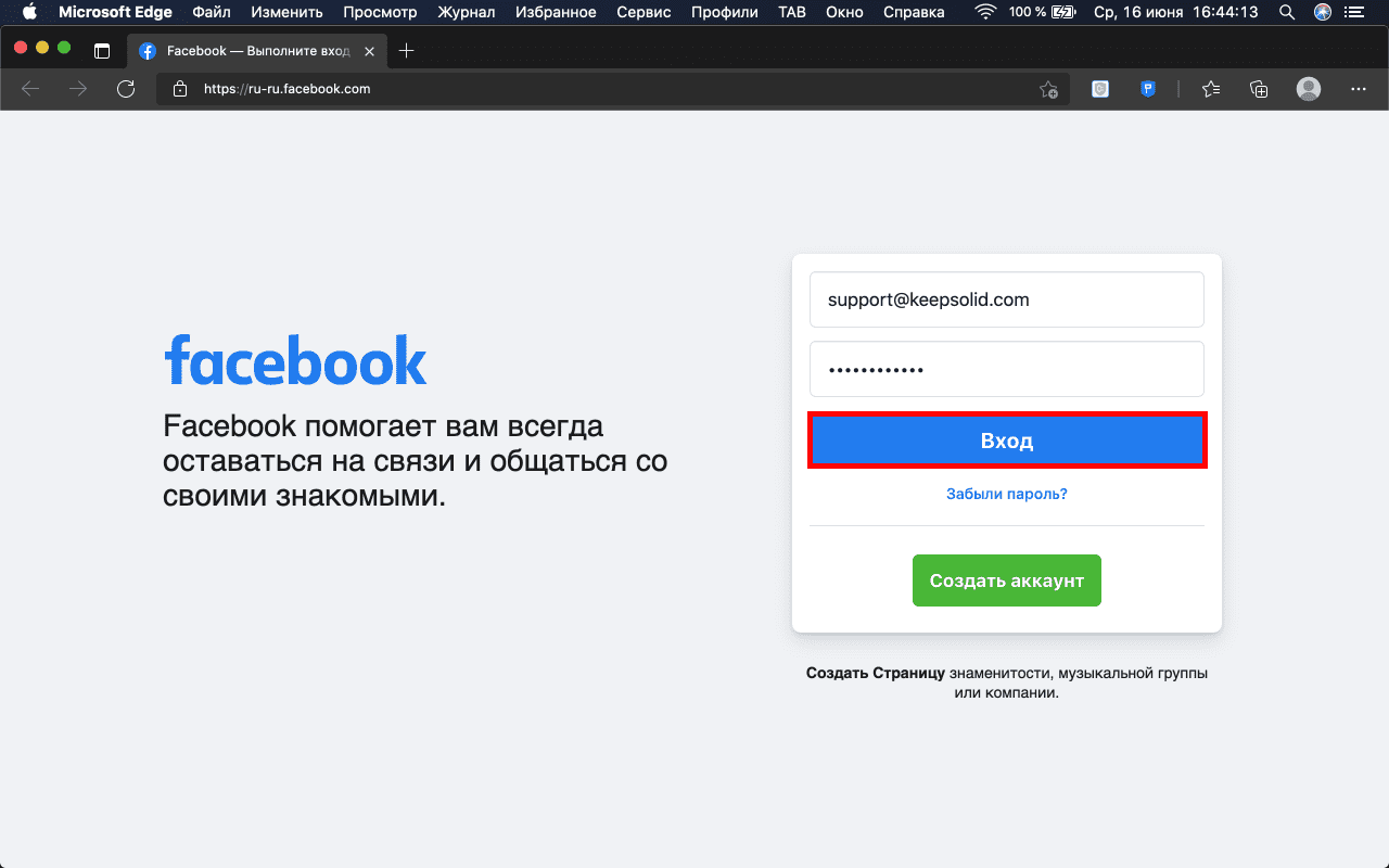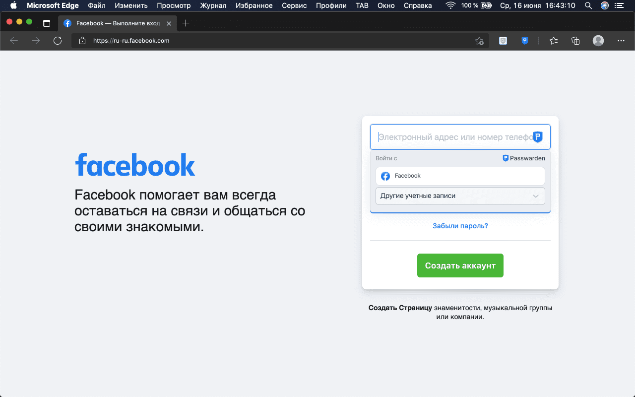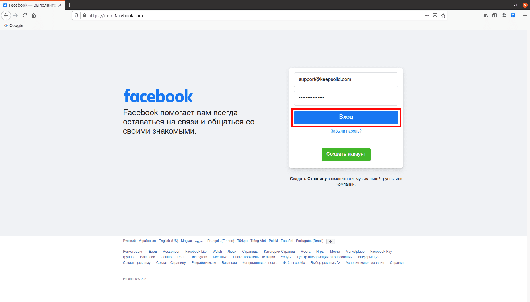 1. Перейдите на любую страницу, например, откройте Facebook. Войдите в свой профиль как обычно.