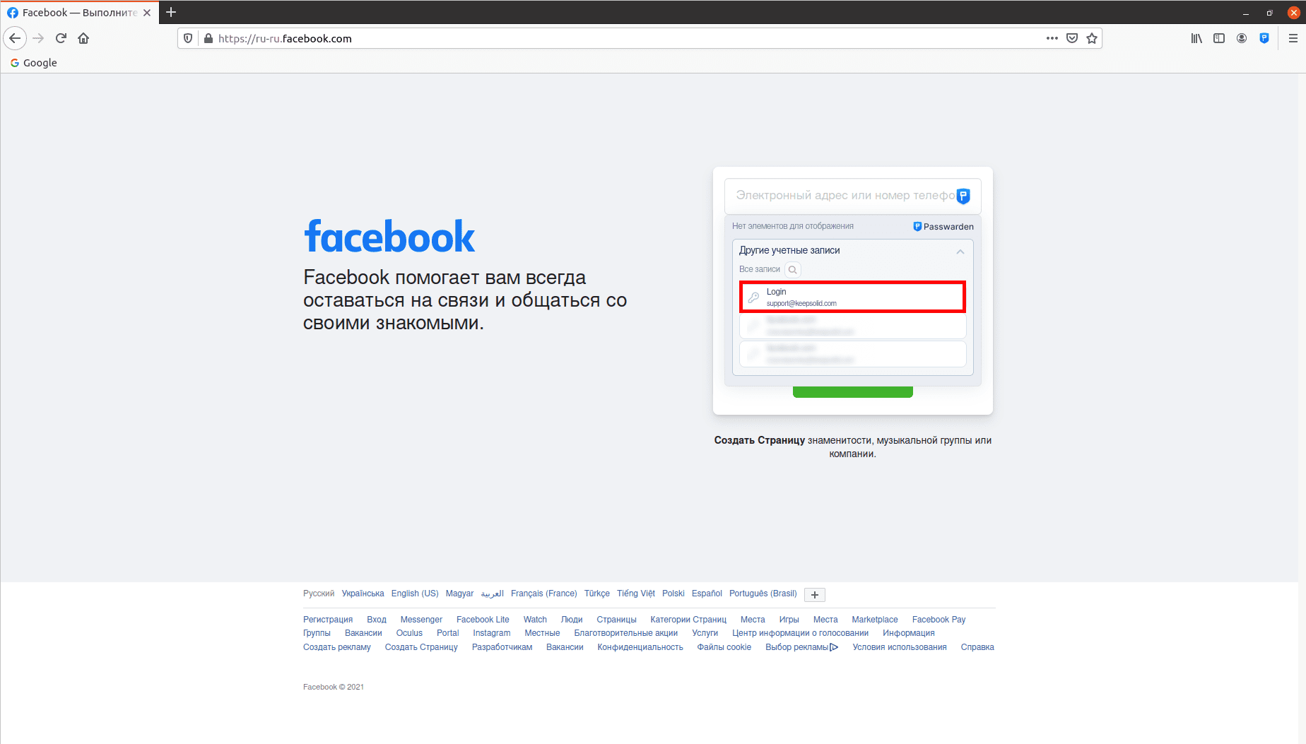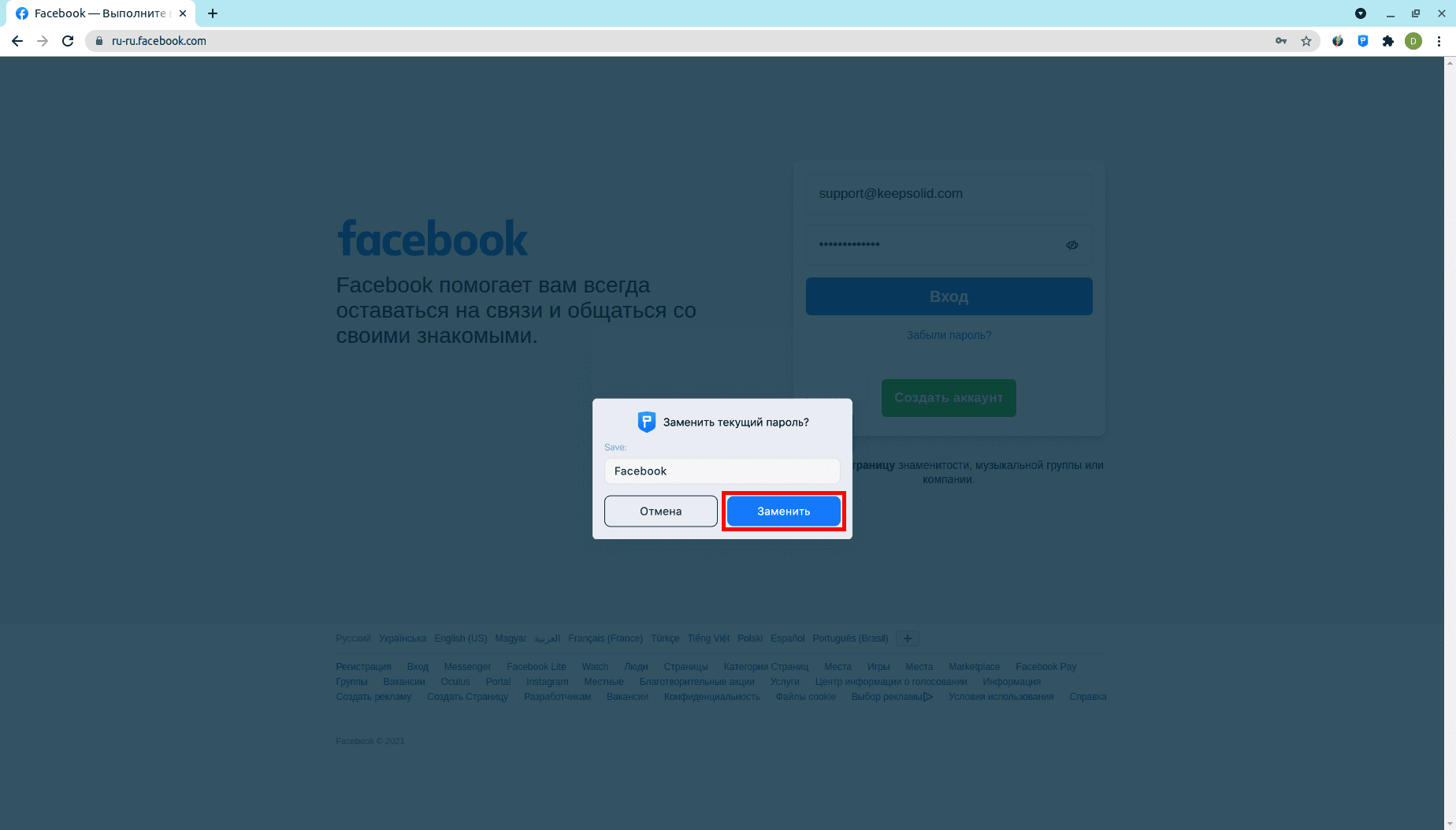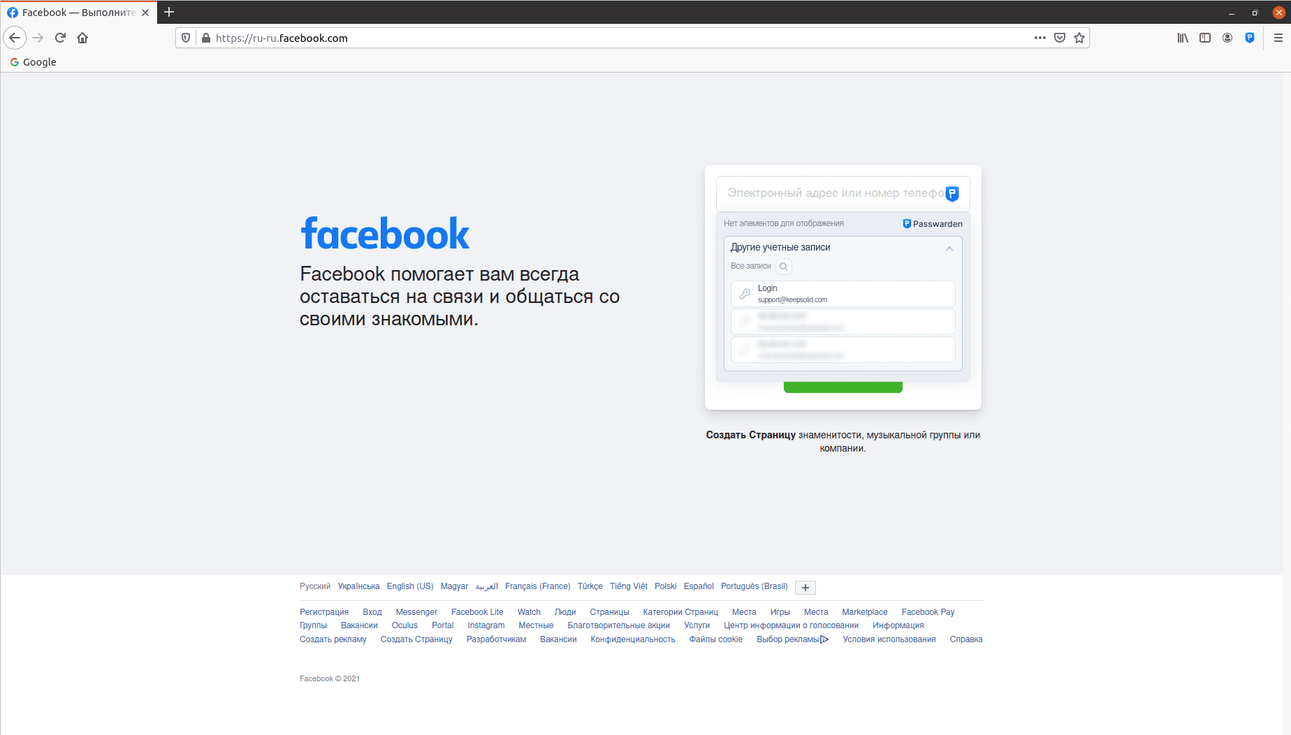 1. Перейдите на любую страницу, например, откройте Facebook. Войдите в свой профиль как обычно.