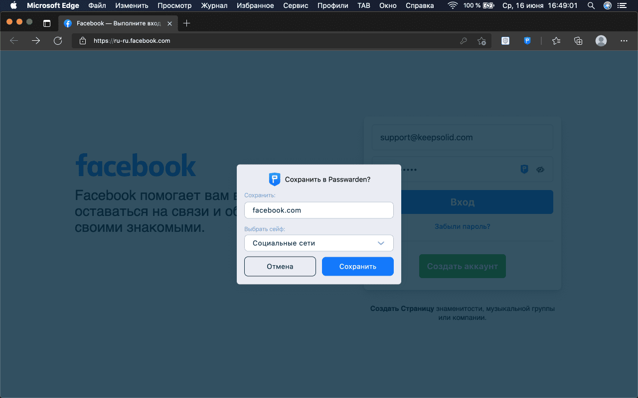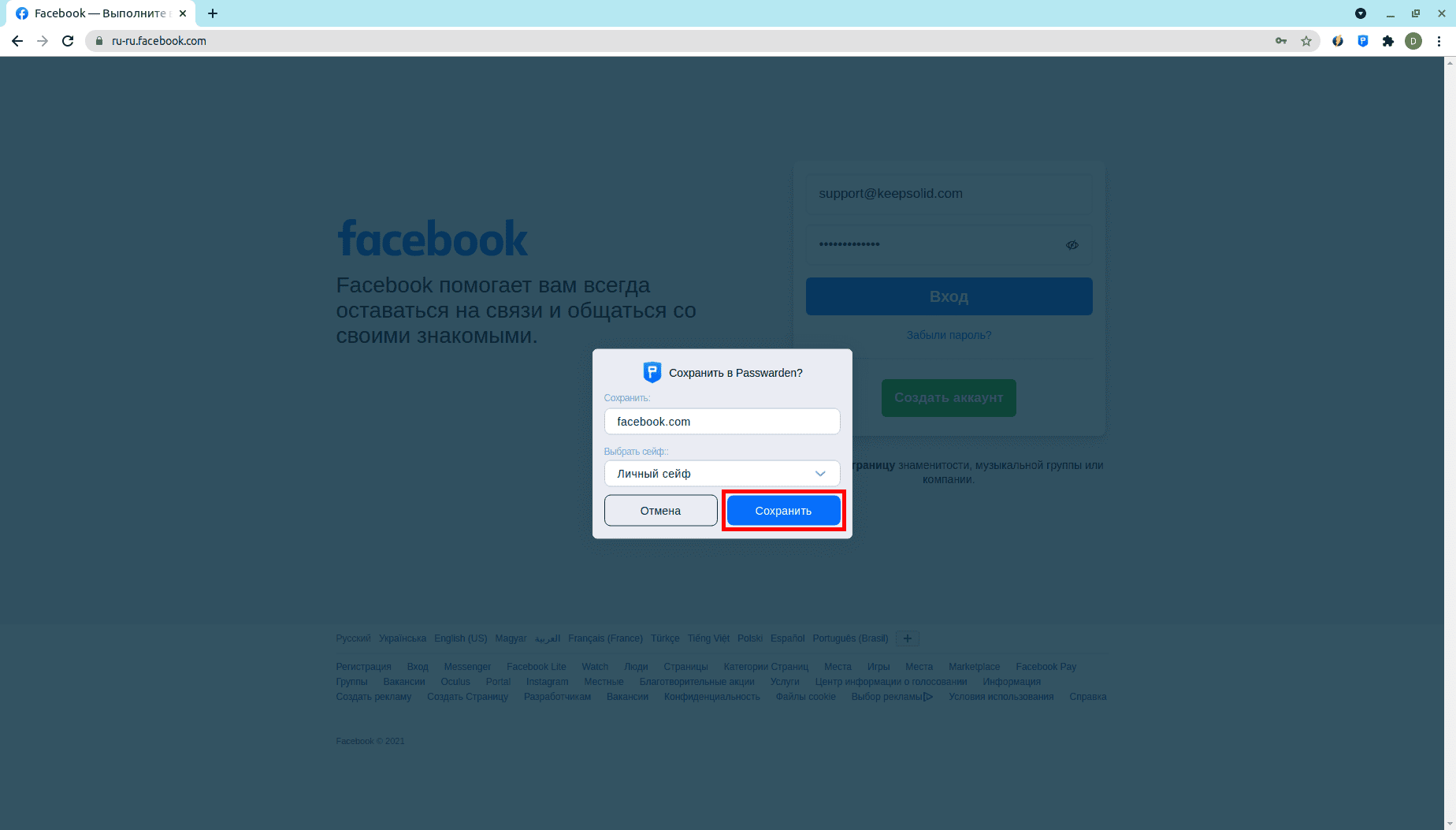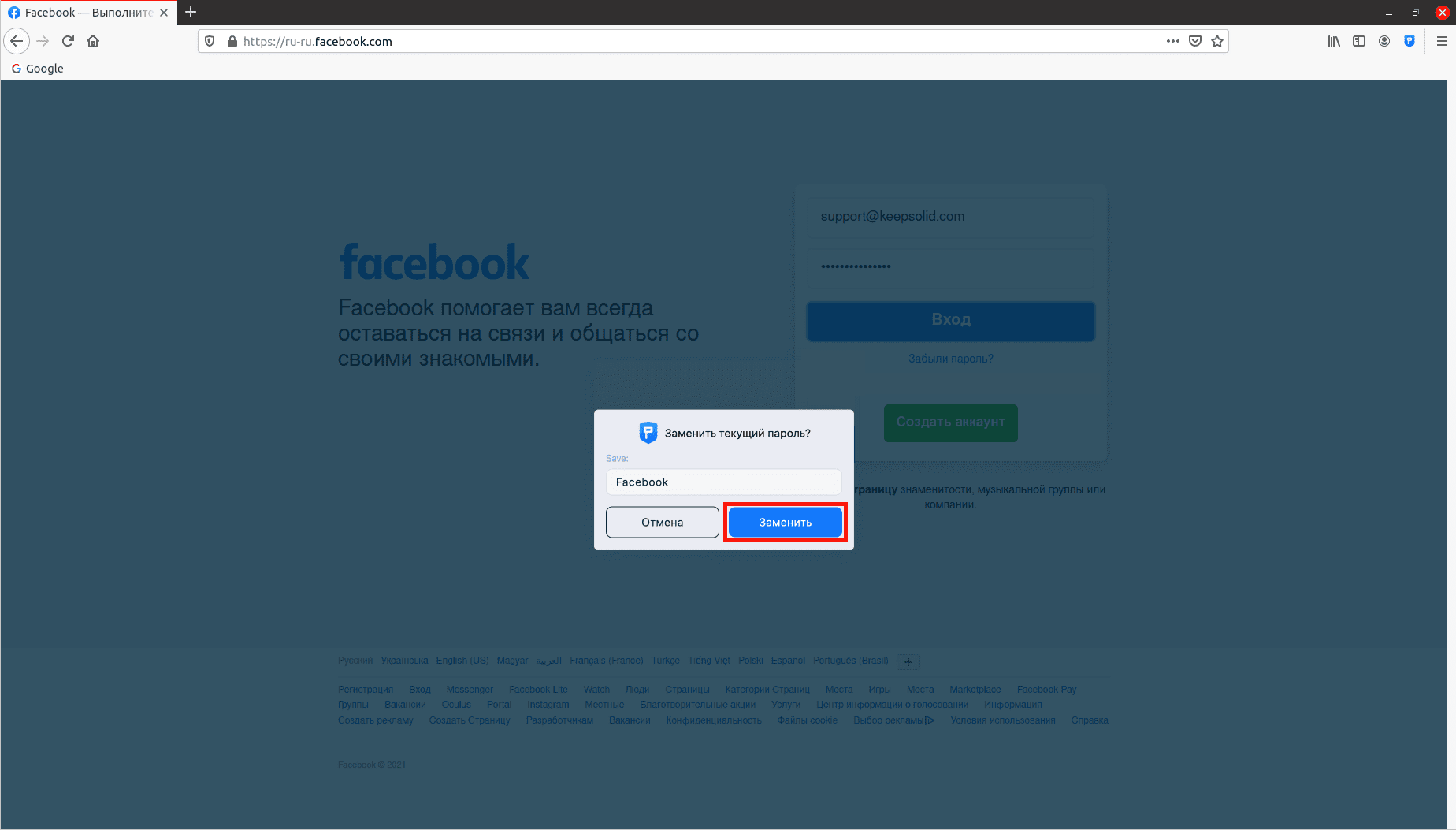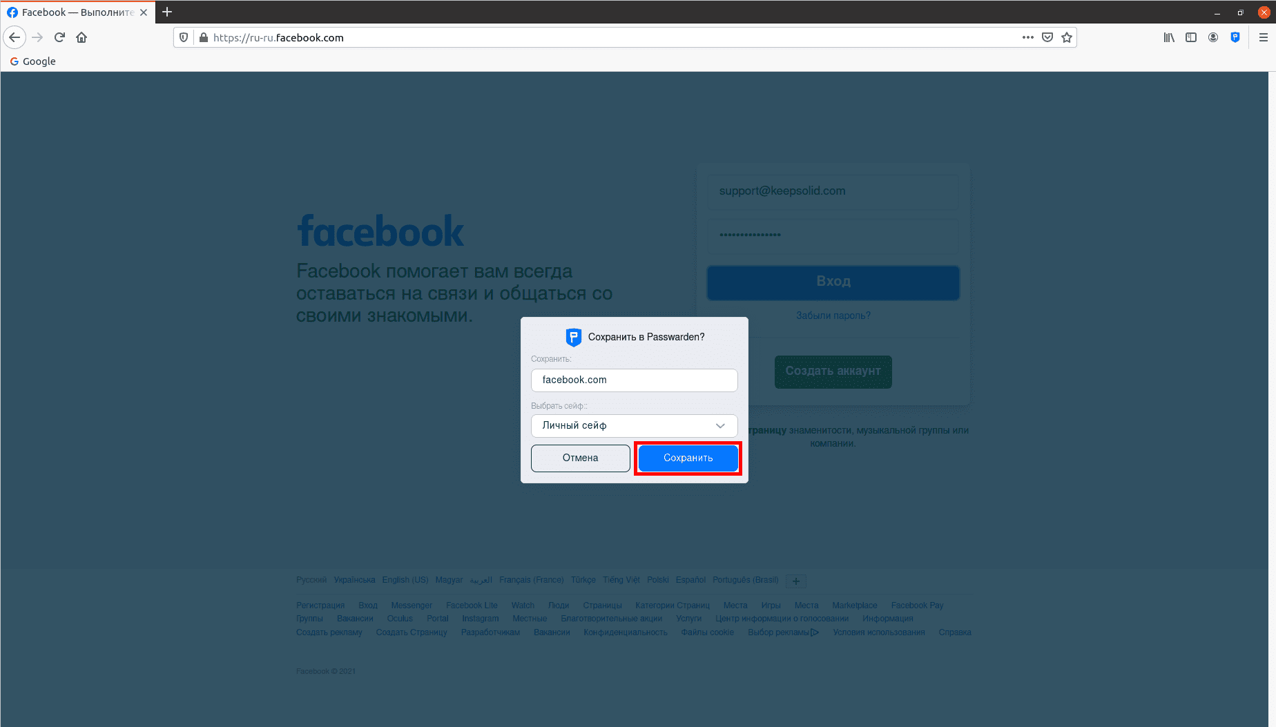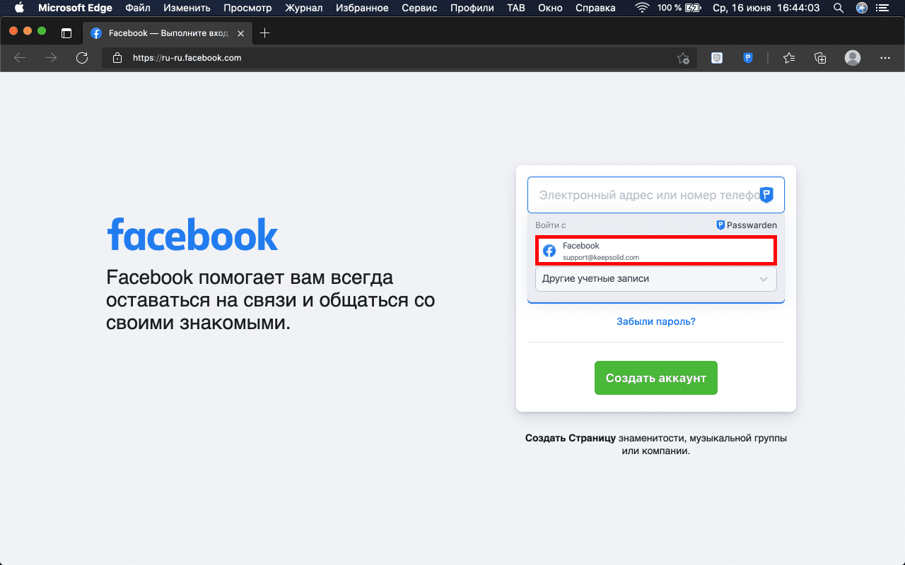 1. Перейдите на любой сайт, например, Facebook, и войдите в свою учетную запись как обычно.