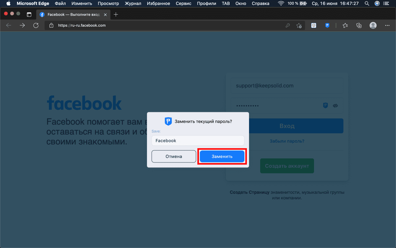 2.1. Если в Passwarden уже есть записи, связанные с этим сайтом, вы увидите запрос об обновлении этой записи. Для этого нажмите Заменить.