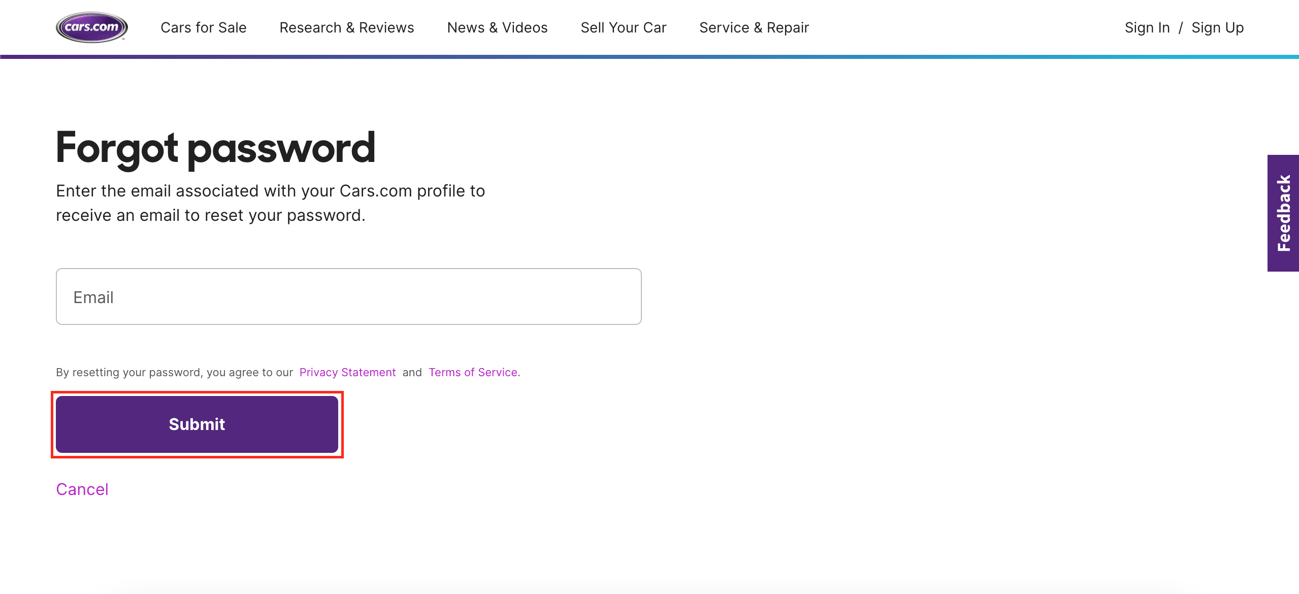 4. Type in the email associated with your Cars.com profile to get an email to reset your password, and press Submit.