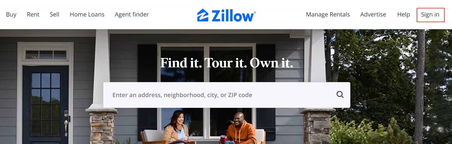 1. Go to zillow.com and click on the Sign In link at the top-right corner of the screen.