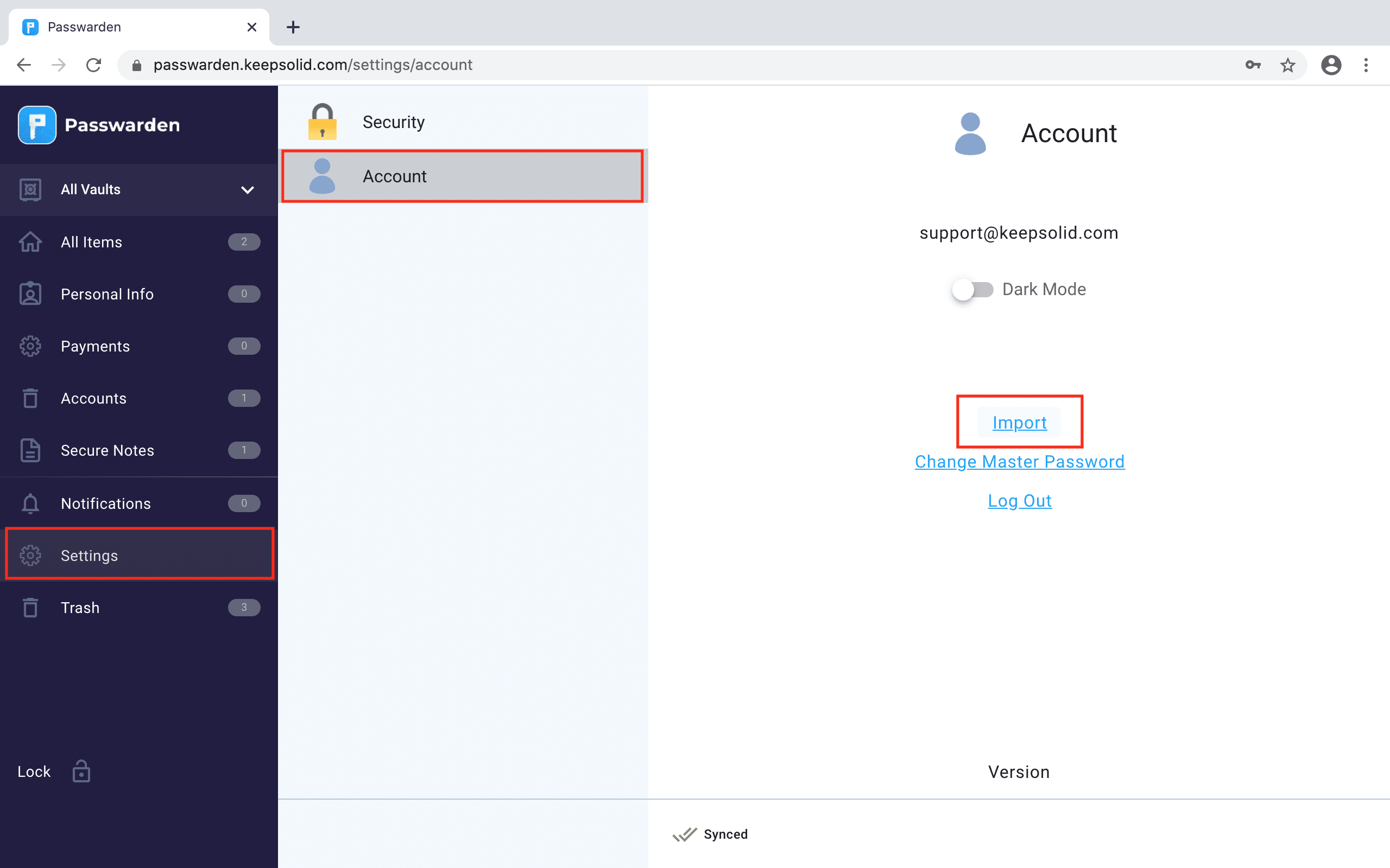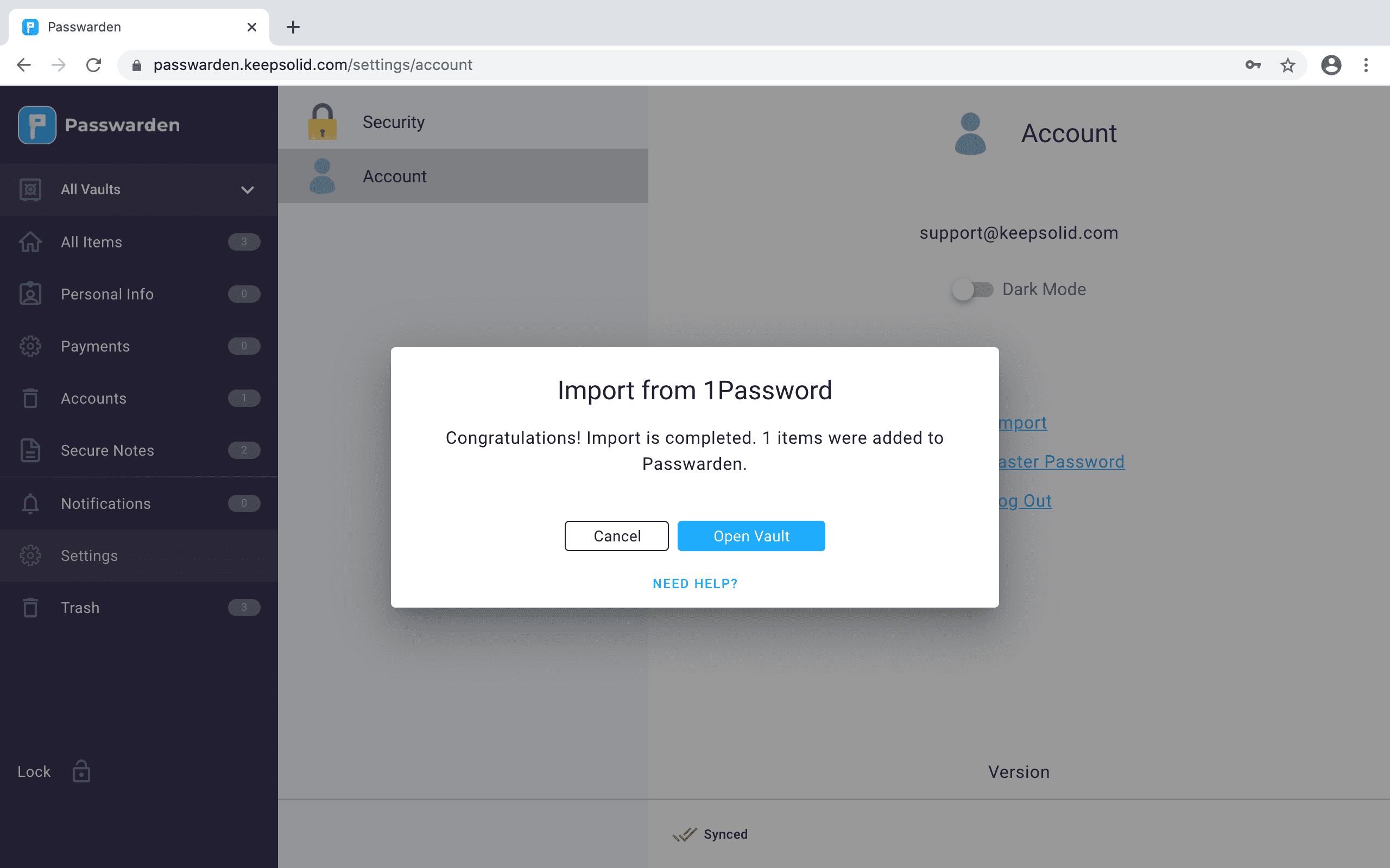 3. Select the Vault you want to import your data to and upload the exported file. Press Import.