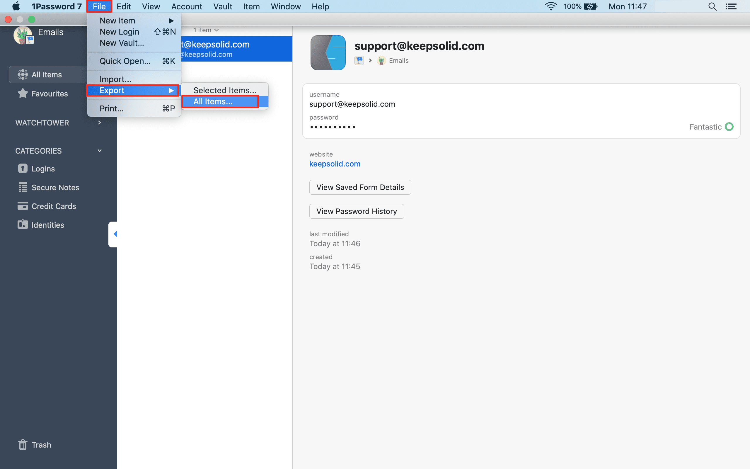 1. Open 1Password on your macOS or Windows device and go to the All items tab. Press File > Export… > Export all items.