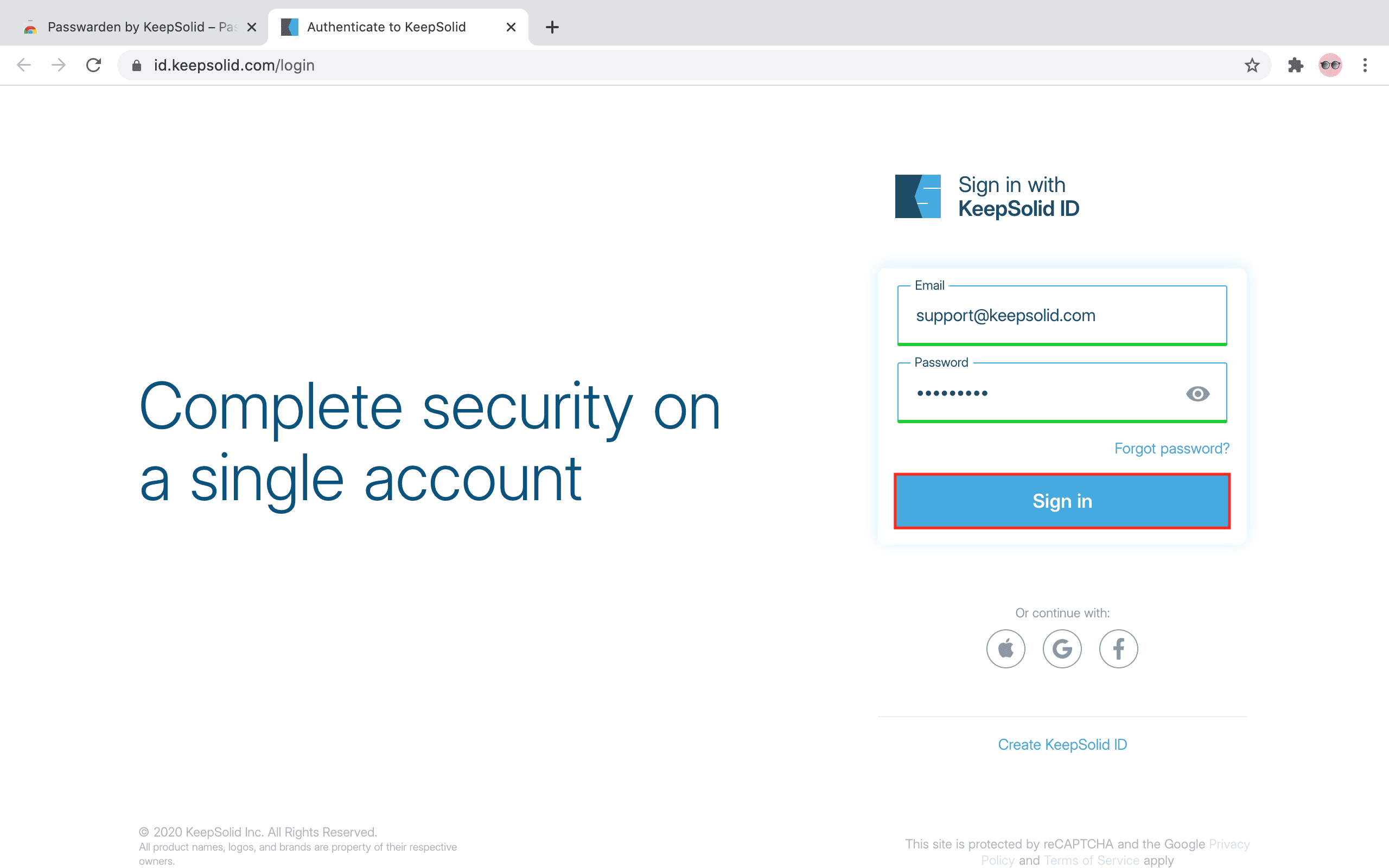 3. You’ll be automatically redirected to the Passwarden web application. If you already have a KeepSolid ID, enter your email and password and press the Sign in button.