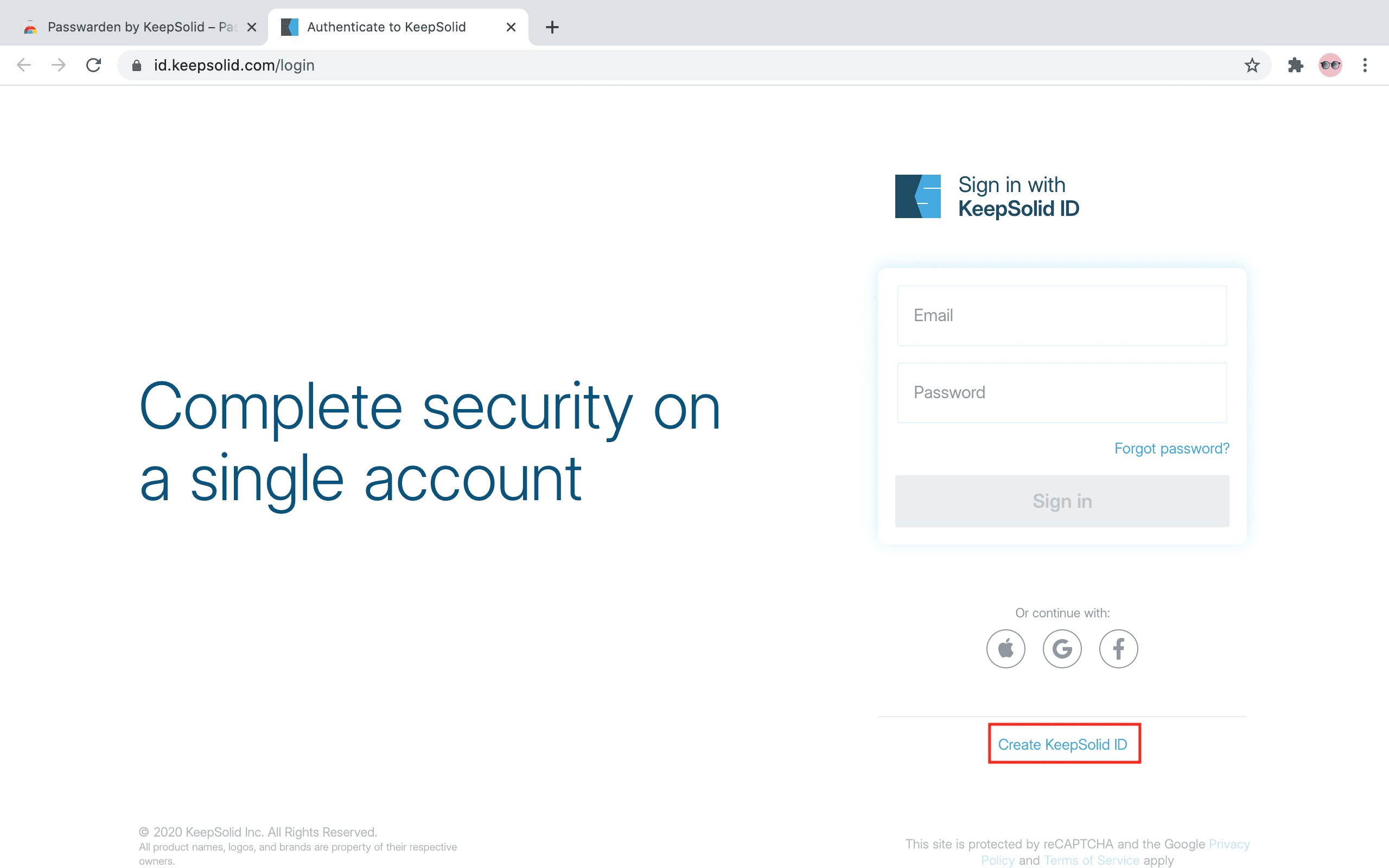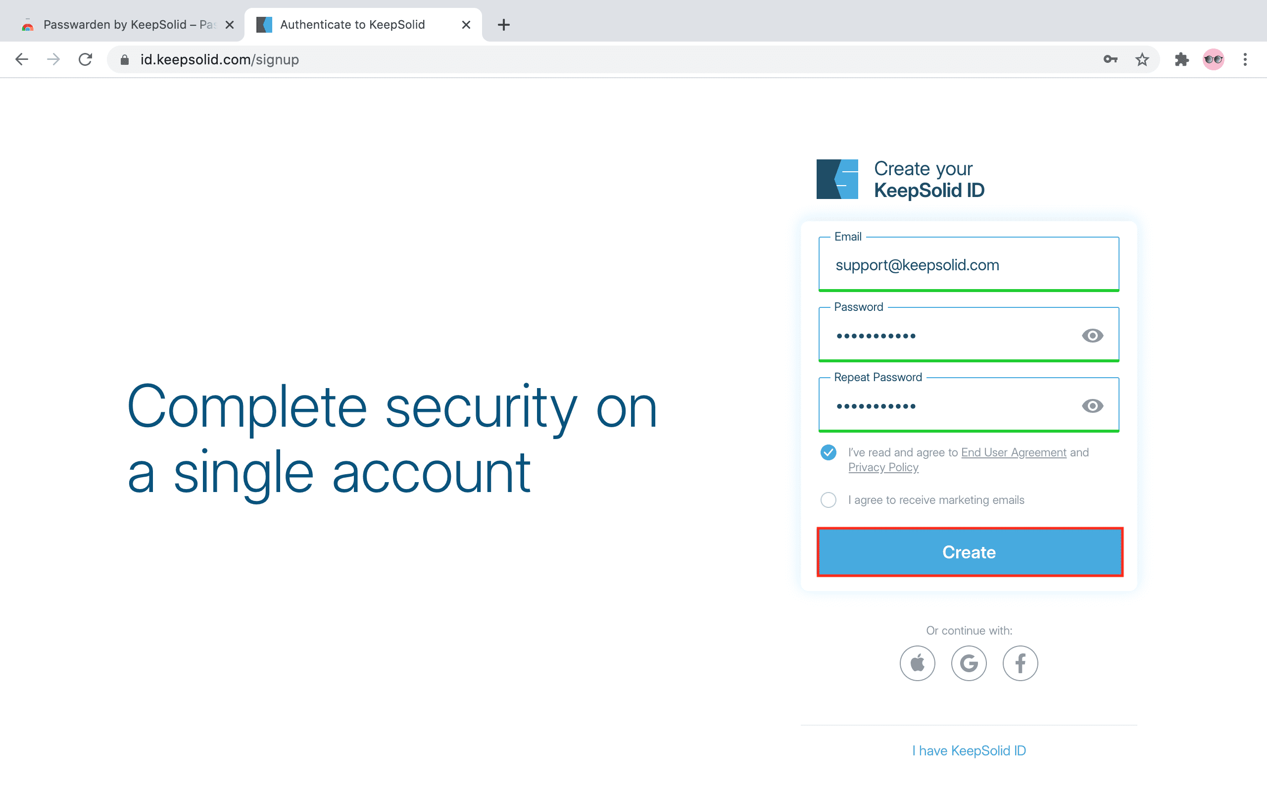 Or you can create a new KeepSolid ID. To do this, click Create KeepSolid ID, print your email address, set up a password, and confirm it. Check the box next to I’ve read and agree to… and click Create.