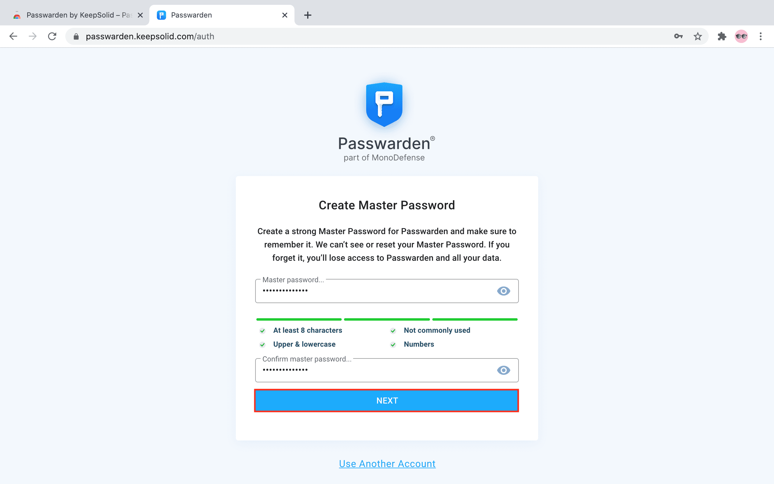 2. Create your Master Password - password for the Passwarden account, confirm it, and press Next.