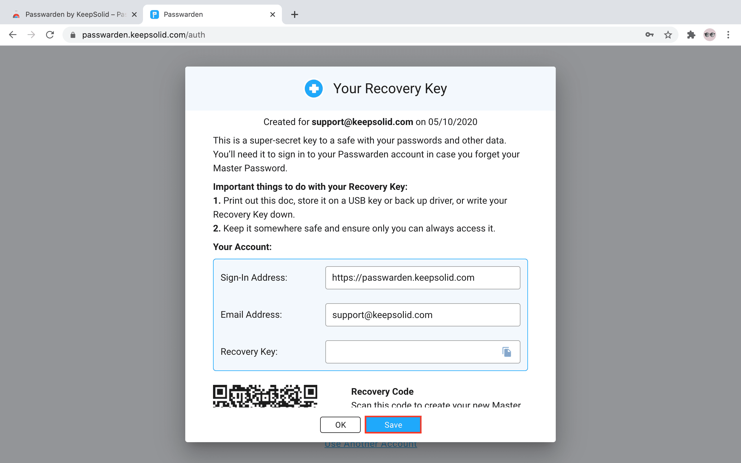 Note: If you forget your Master Password, you’ll need this Recovery Key to sign in to your Passwarden account. So make sure to save it in a secure place.
