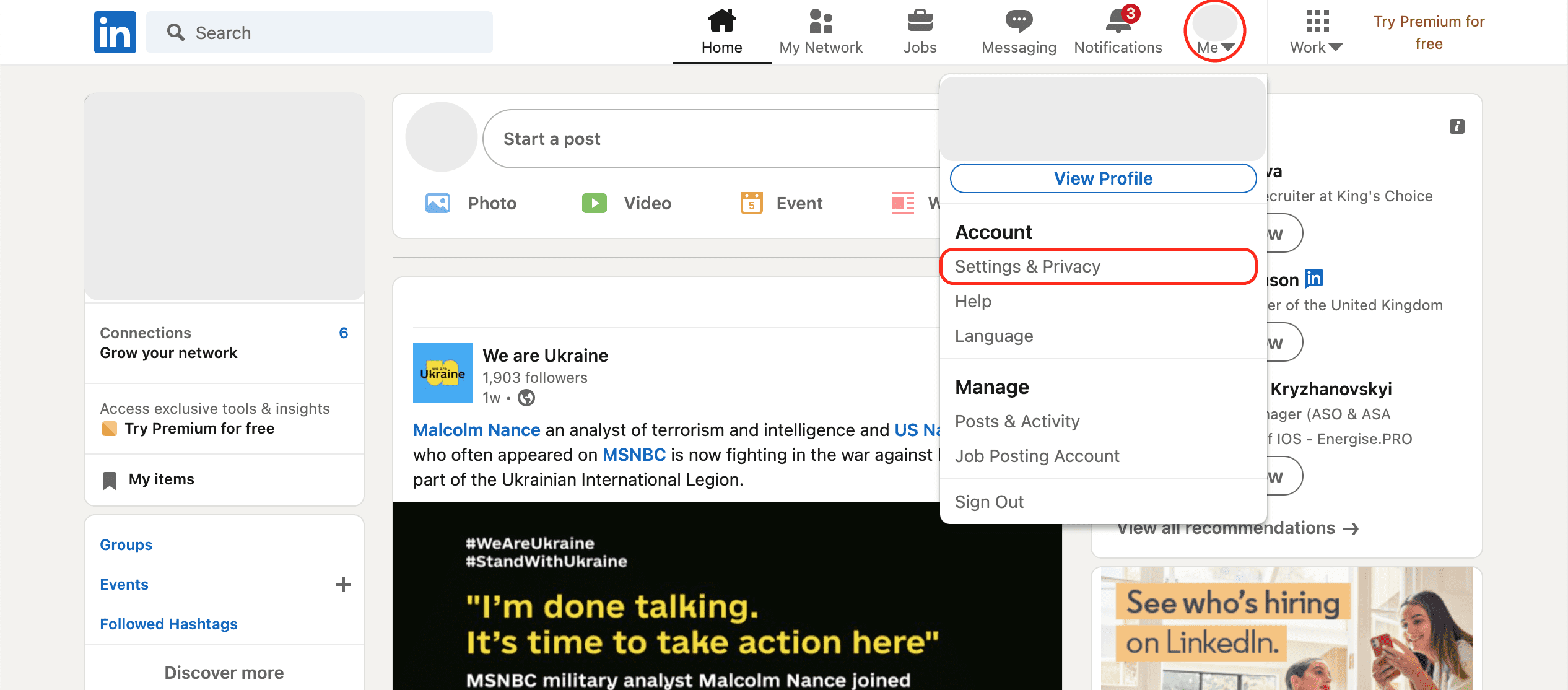 1. Почніть із натискання піктограми «Я» у верхній частині домашньої сторінки LinkedIn