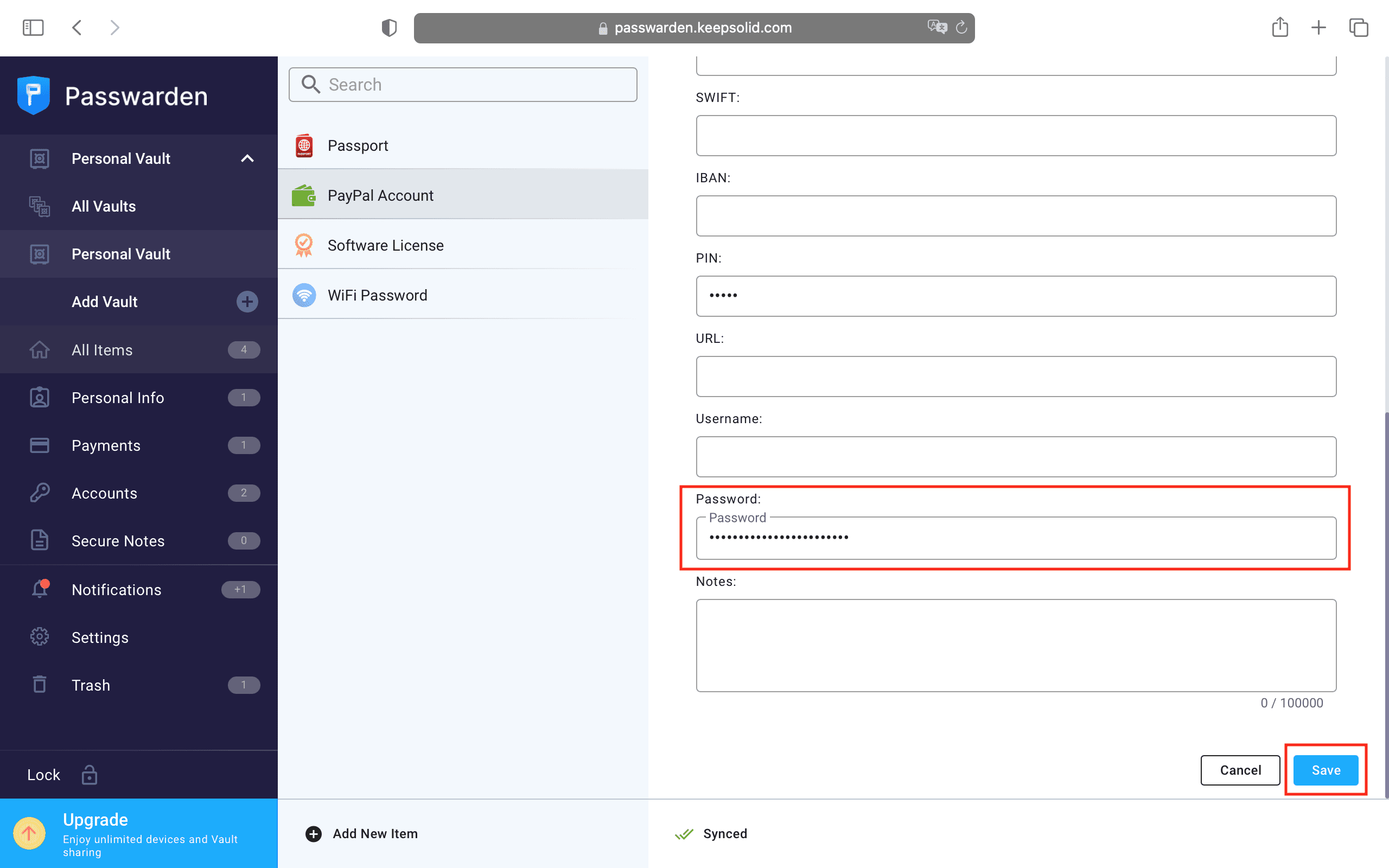Тепер ваш пароль PayPal успішно оновлено та збережено у вашому сховищі Passwarden.