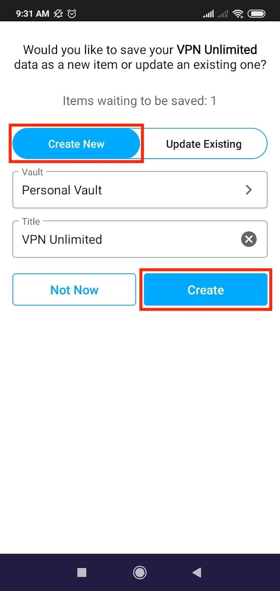 1. Select the Create New option, choose the appropriate Vault, and edit the name of this new item. The name of the application is entered by default.