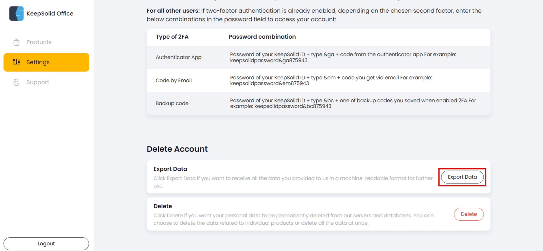 3. Scroll down to the Delete Account section and press Export Data.