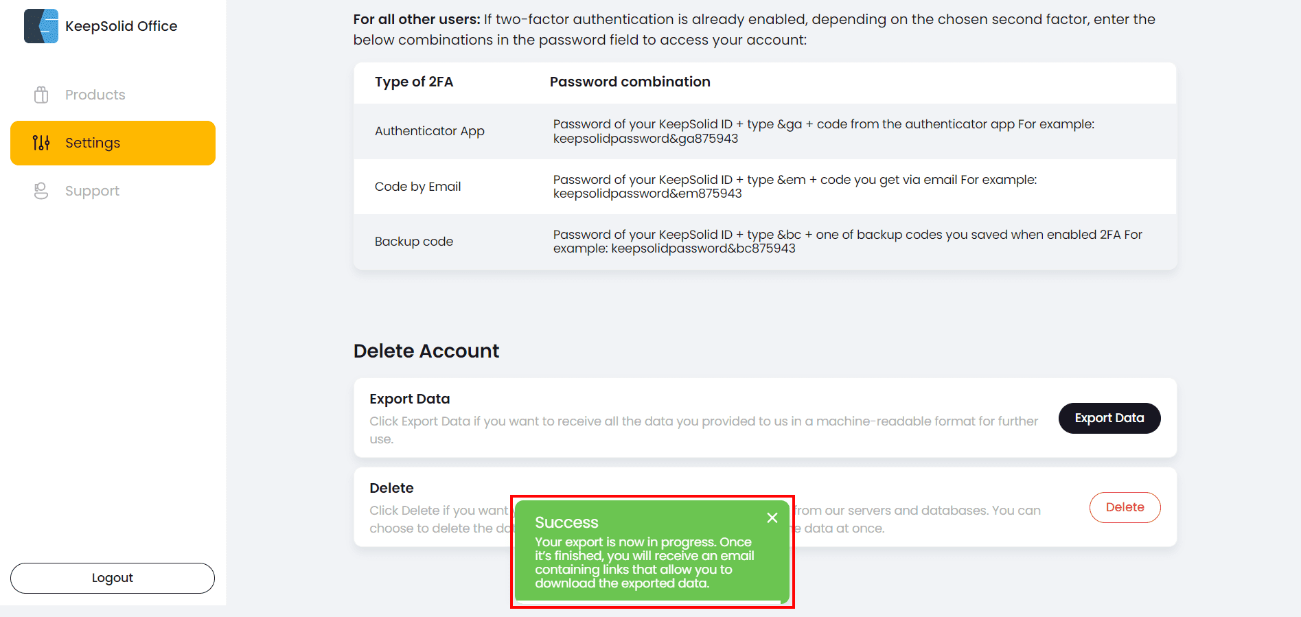 After all your data successfully exported, you will receive an email with the links to your information: data of your KeepSolid account and information related to the KeepSolid services you've used.
