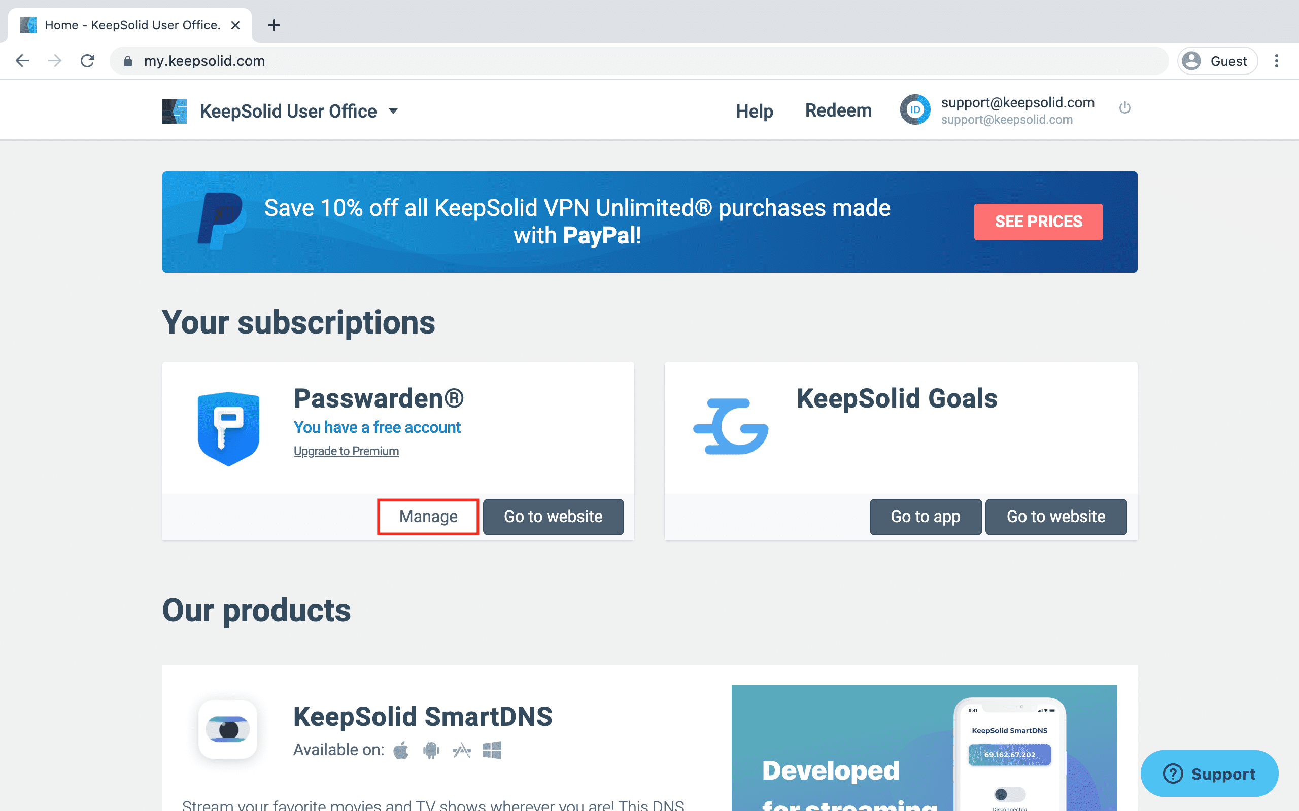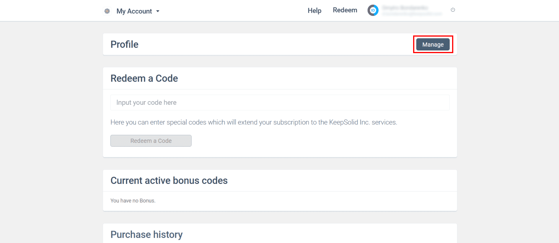 2. Click your KeepSolid ID at the top right corner, and press Manage to enter the Profile Settings menu.