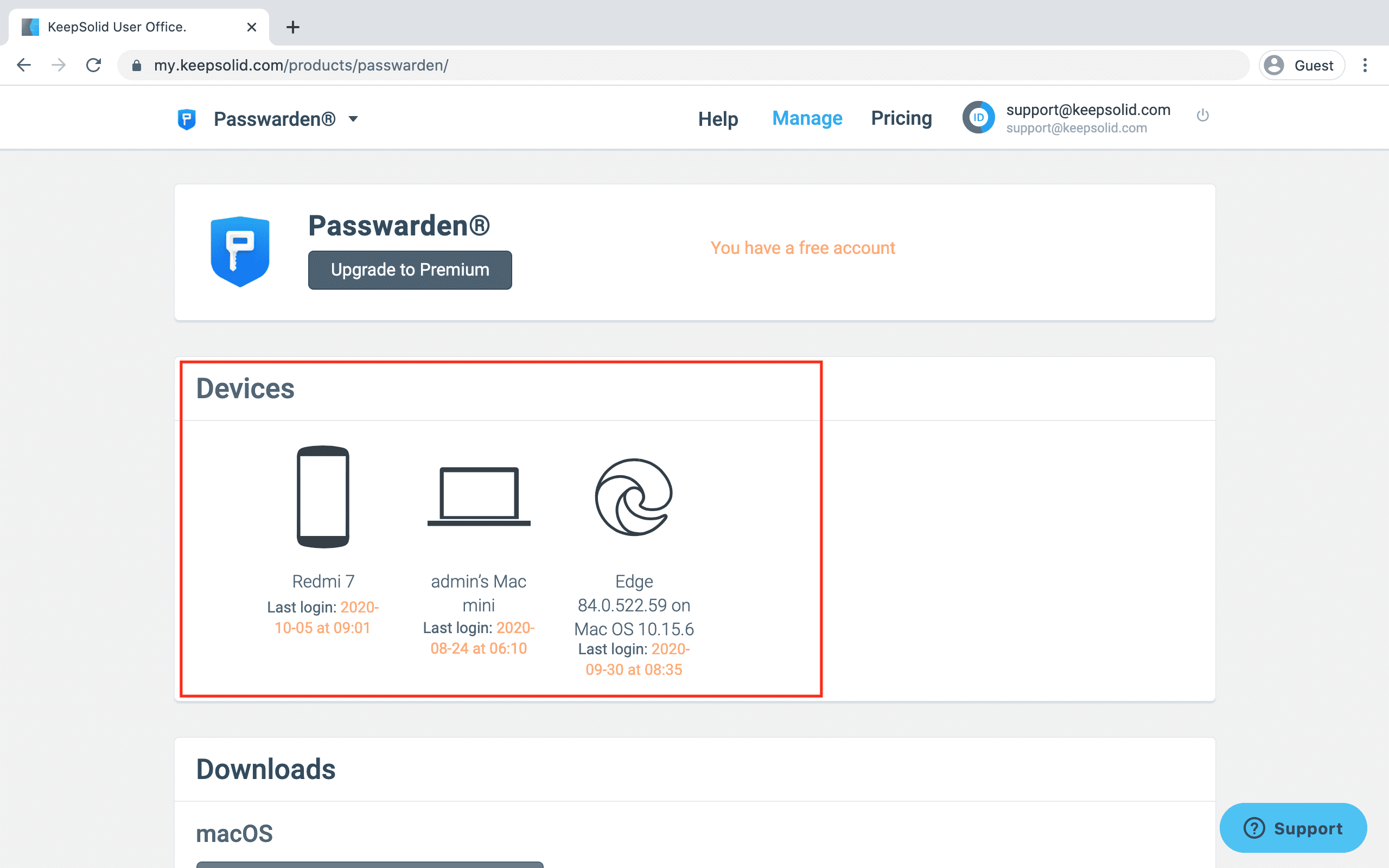 To view a list of used devices, press Manage near to the Passwarden and scroll down to the Devices section.