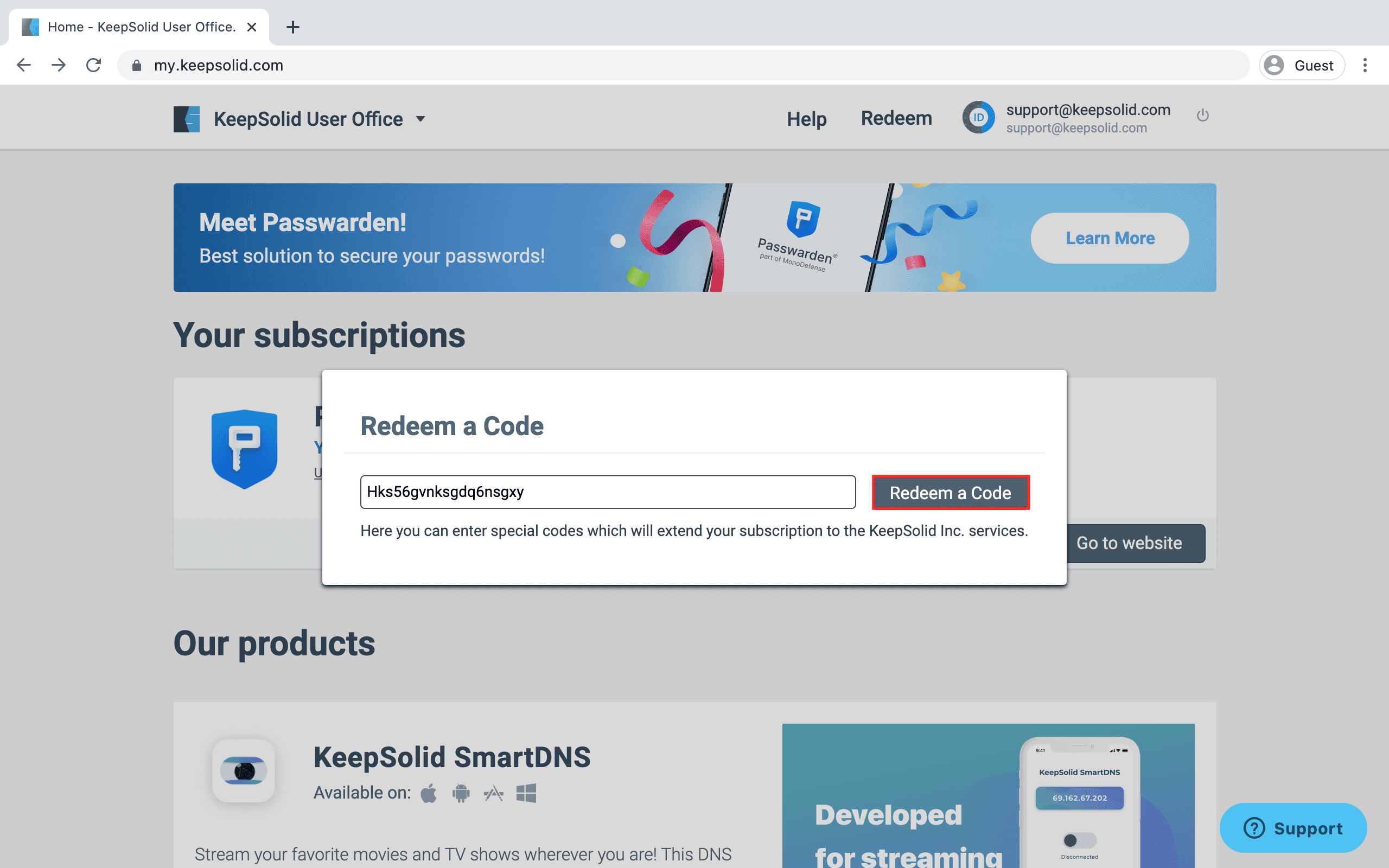 Great! If the code is a correct one, the appropriate subscription will be automatically added to your account.